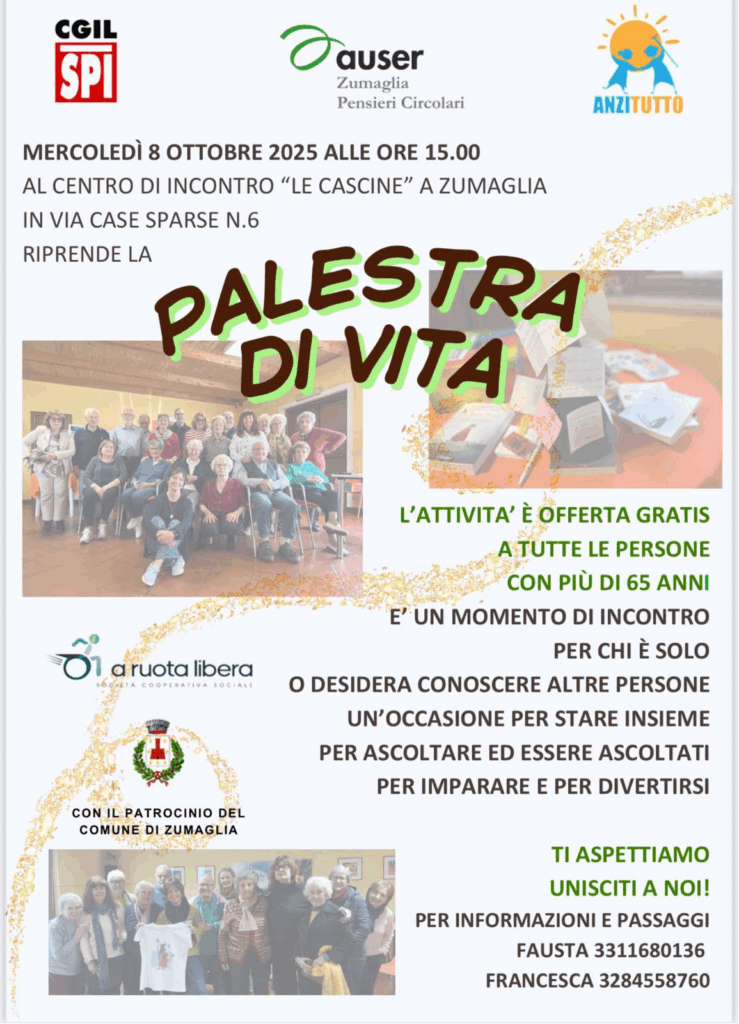 Da mercoledì 8 ottobre 2025 riprende “Palestra di Vita”, un momento di incontro, un’occasione per stare insieme, per ascoltare ed essere ascoltati, per imparare e per divertirsi!